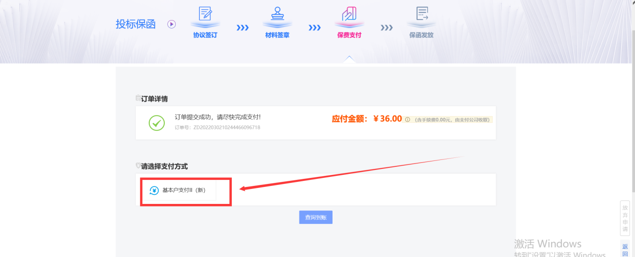 7、投标人选择“基本户支付”(企业需使用基本账户支付费用)并向指定账户支付担保费用,付款成功待银行核验成功后自动出具保函(期间需等待大概5分钟)