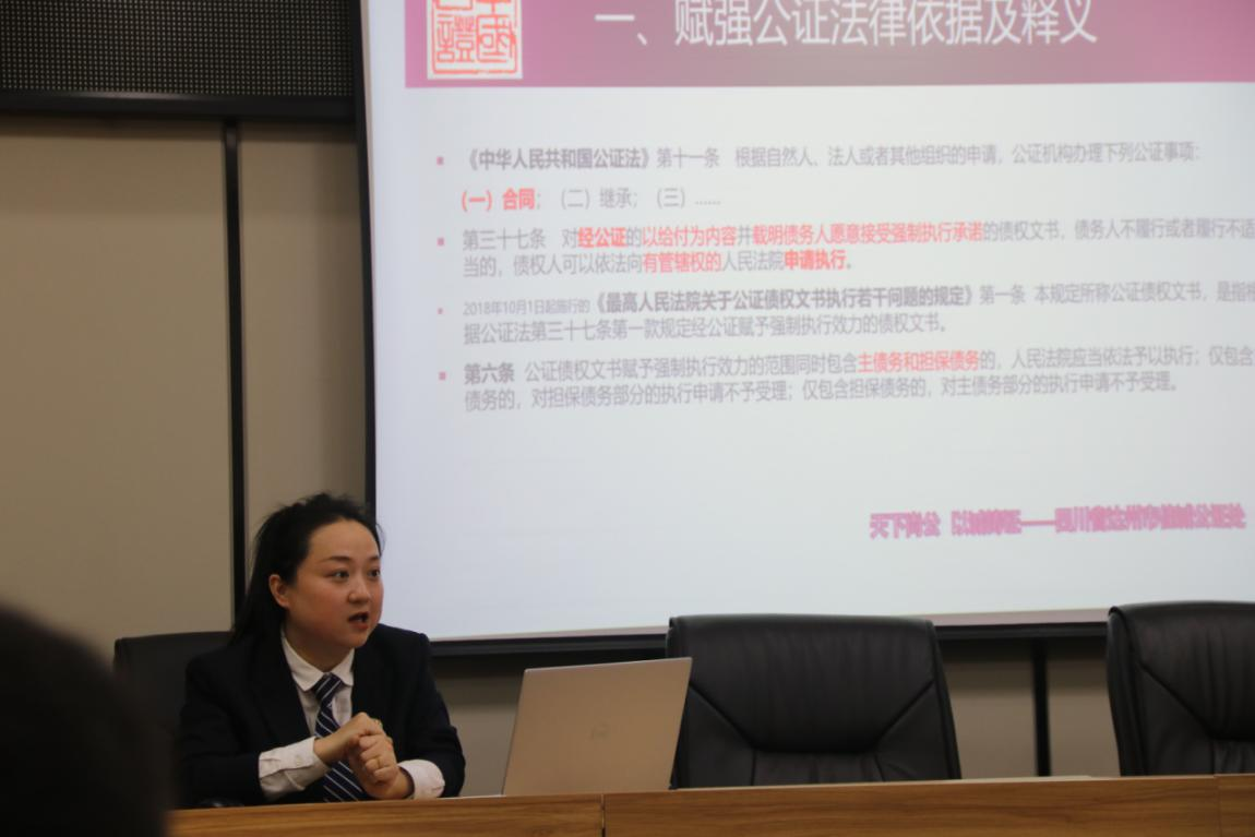 为进一步提升员工法律专业素养,充分发挥公证作为预防性法律制度的作用,积极促进公证服务金融、实施多元化风险化解机制,推动公司高质量发展,公司特邀达州市佳诚公证处业务发展部部长、公证员唐小露围绕“关于赋强公证的相关法律问题”进行专题培训。